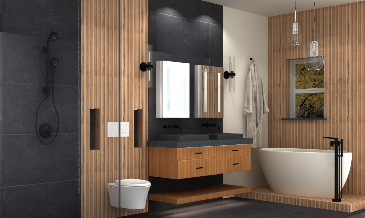 After years of minimalist wet rooms taking center stage, the classic soaking tub is making a major comeback. Comfort is the new luxury, and a deep tub offers the perfect spot for relaxation and self-care. To complete the spa-like experience, homeowners are styling their tubs with accessories like bath racks, essential oils, lush greenery, and softly flickering candles. Paneled walls are also on the rise. We ourselves enjoy tile that mimics the look of wood paneling (seen below) to enrich the space into an oasis while still being bathroom friendly.